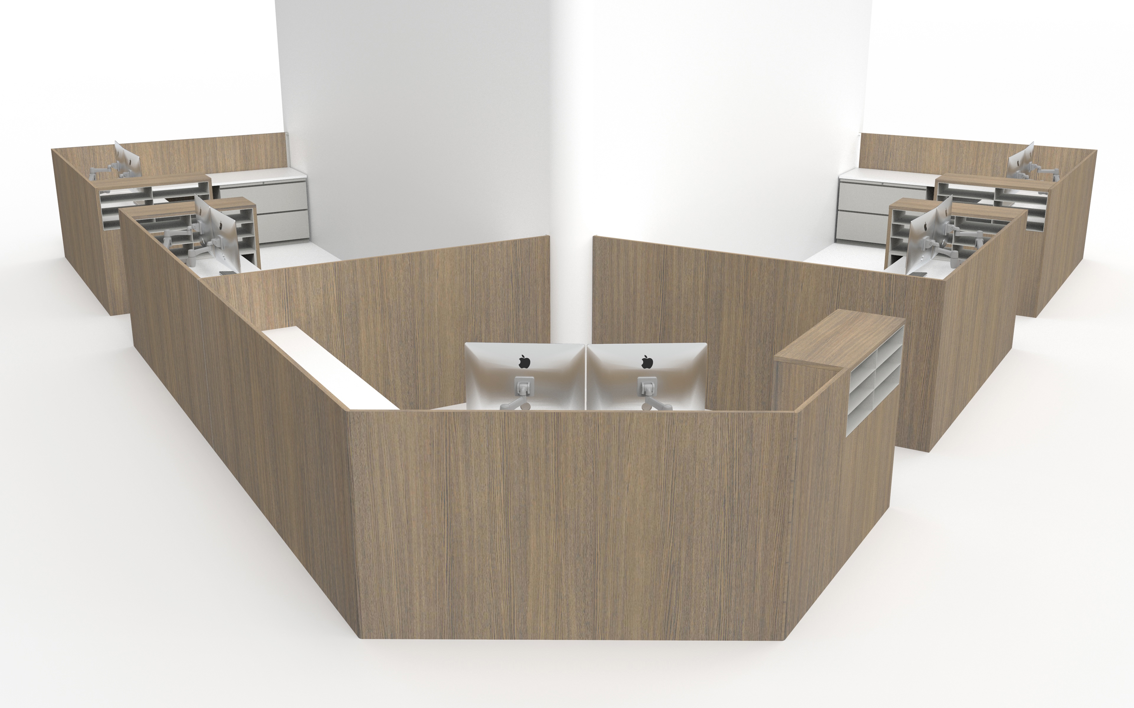 The design approach began with the exterior form, ensuring each workstation aligned with the building’s sharp angles and premium look. From there, Studio Other worked inward, developing functional layouts that addressed storage needs, ergonomics, and day-to-day usability within unconventional footprints. A strategic material palette balanced performance and cost, combining wood veneer exteriors for a refined appearance with laminate work surfaces and metal storage to meet budget requirements. Varied storage solutions were also introduced to complement the triangular forms and enhance flexibility.